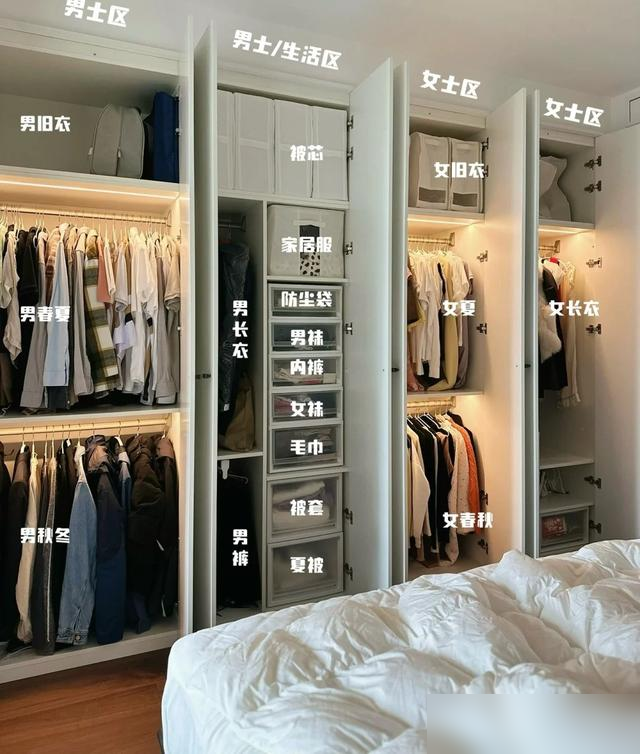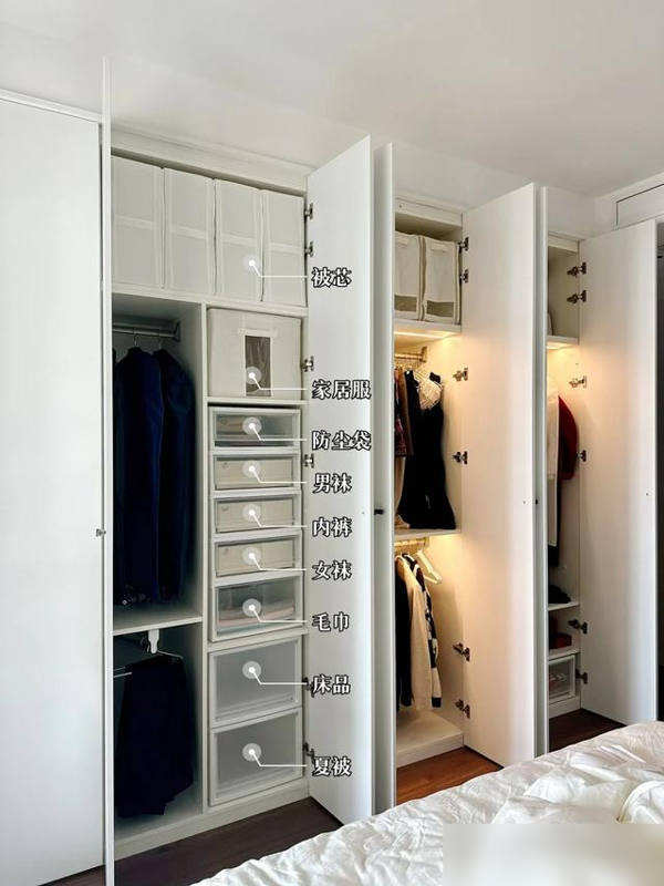 衣柜里塑料抽屉柜分层放袜子、内衣或床品,比定制抽屉便宜又灵活,空间利用加倍。