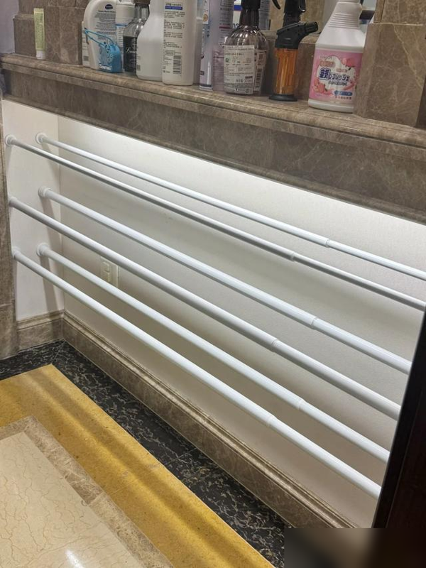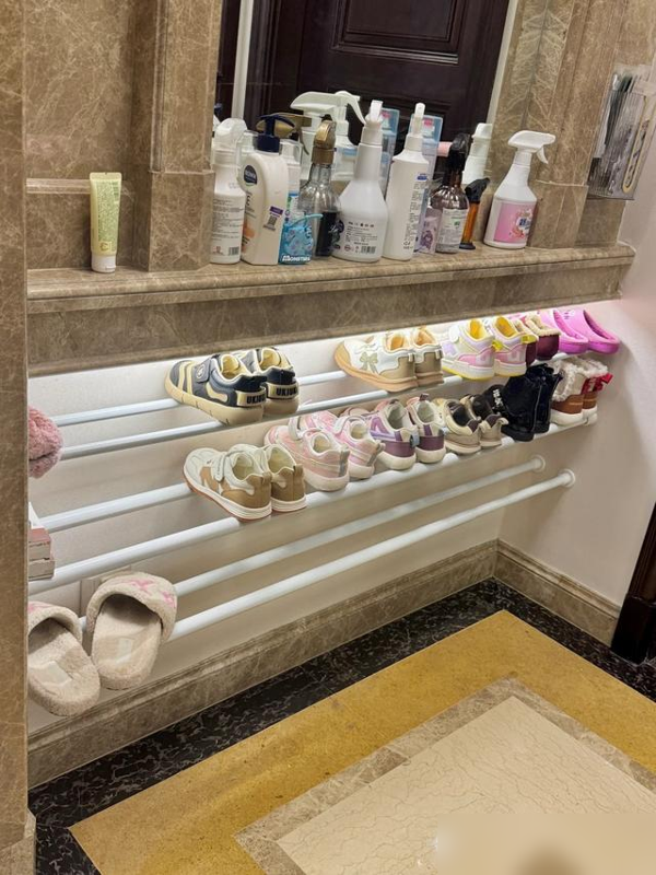 伸缩杆撑在玄关窗户下,一家子的常穿鞋和拖鞋都能塞进去,墙面贴层静电膜护着,鞋头不脏墙。