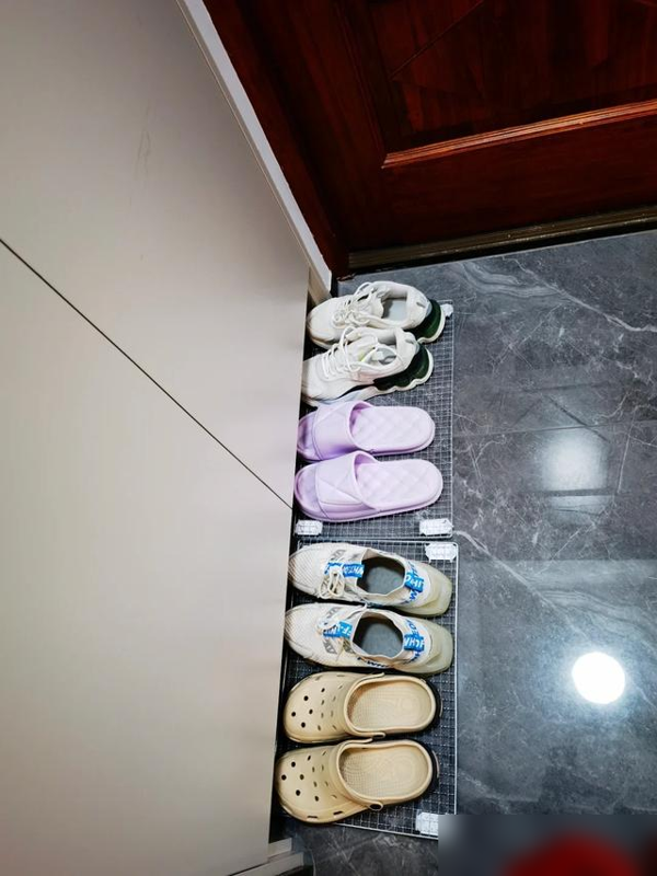 烧烤架加几个轮子就成了可移动鞋架,换鞋不用弯腰,雨天鞋湿了还能通风沥干。
