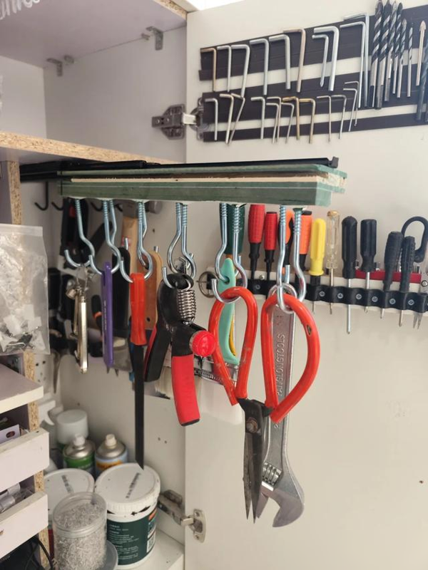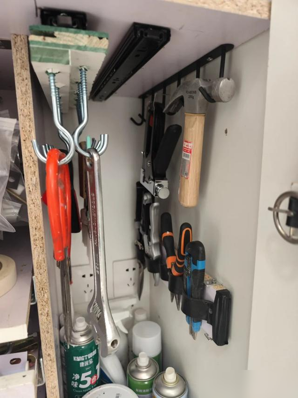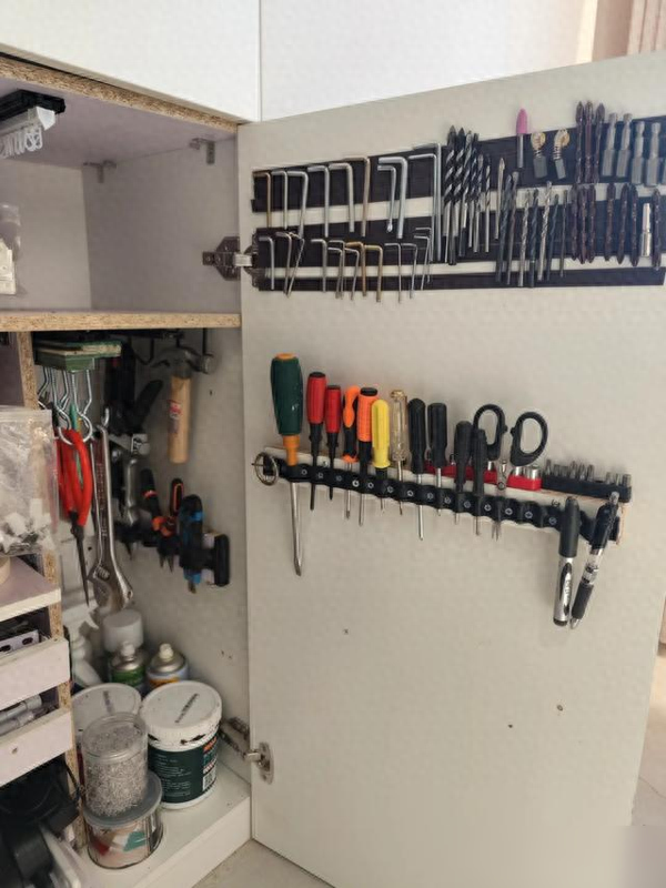 磁吸条钉柜门放小工具,窄木条加羊眼钩挂配件,侧边钩子吊零碎件,一目了然。