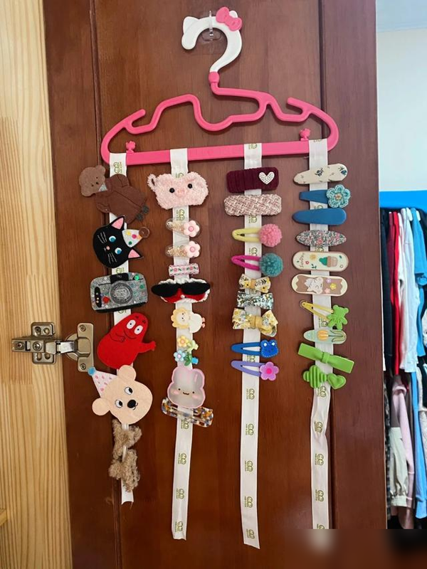 女儿的发夹用衣架绳子夹起来,找起来不用翻箱倒柜。