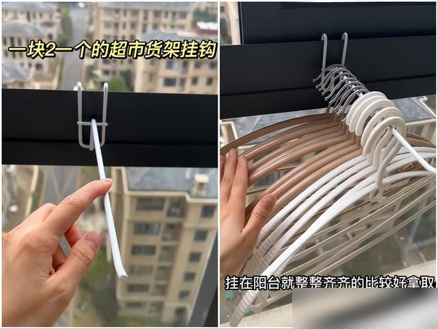 衣架挂钩用超市货架款,贴在阳台窗边,衣架挂得整整齐齐,拿取不打架。